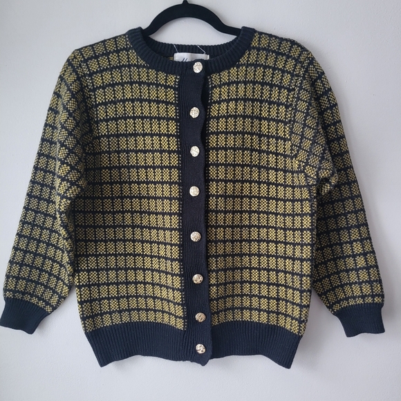 Luxurious knit cardigan featuring a striking geometric pattern. Metallic gold design contrasts beautifully with black trim. Gold-tone buttons add elegant detail. Ribbed cuffs and hem complete this sophisticated piece. Has some wear and piling. There is no fabric tag or size. assuming a size small (see measurements for better fit ) and possibly wool blend, material is slightly itchy.