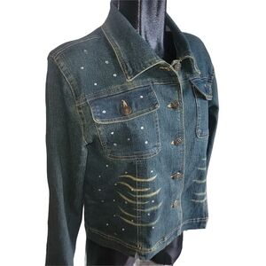 Stylish denim jacket with rhinestone details. Features button closure and distressed accents. Has 2 flap button closure chest pockets.