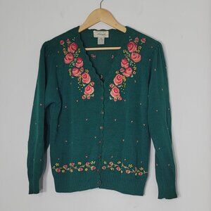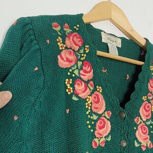 Margules Green Pink Red Embroidered Roses Cotton Blend V-Neck Button Up Cardigan