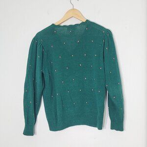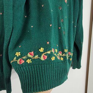 Vintage Margules Green Knitted Stunning Pink Red Embroidered Roses Cotton Blend V-Neck Button Up Floral Cardigan Cottagecore Size Medium