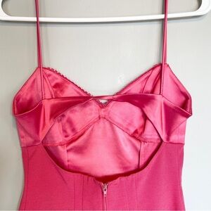 Hot pink structured dress with satin accents, open cut out back, and scalloped hem on bust
