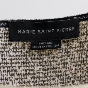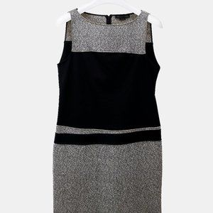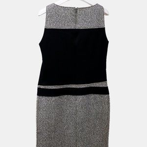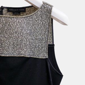 From Canadian designer Marie Saint Pierre, a sleeveless sheath dress cut from beige tweed-like neoprene fabric with black cotton colour block cutouts at the bodice, a bateau neckline, and a half zip closure at the back.