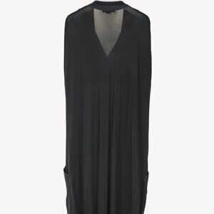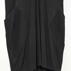 This dress from Marie Saint Pierre is crafted in a slinky black crepe jersey, and features dolman sleeves, a V-shaped neckline with a textured neoprene collar, front patch pockets in a textured neoprene, and a midi-length skirt.