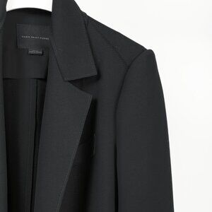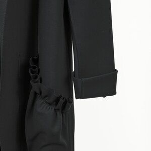 Made in Canada, this coat from Marie Saint Pierre is crafted in a black neoprene, and features long sleeves, vented cuffs, a notched lapel collar, an open front, a double-vented back, and is elevated with ruffled patch pockets on the front.