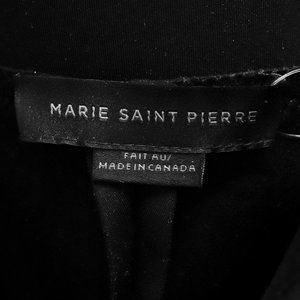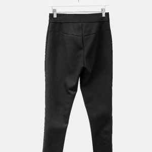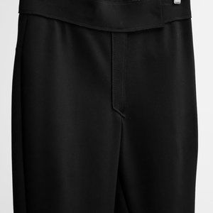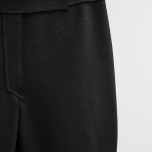 Made in Canada, these simple yet elegant slim pants in black neoprene fabric feature a sleek silhouette with a wide waistband fastened by a bar and snap closure.