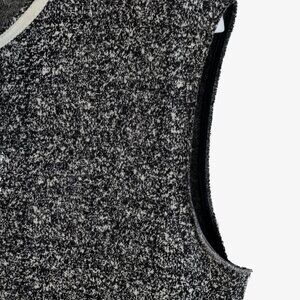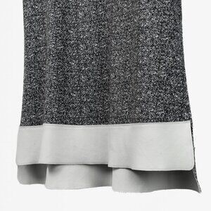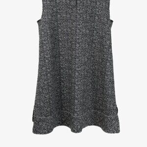 This tweed dress from Marie Saint Pierre is as stylish as it is comfortable. The dress consists of a black and white tweed body, round neckline, no sleeves, and has two bottom slits on both sides of the dress as well as a white polyamide overlay on the hem of the dress.