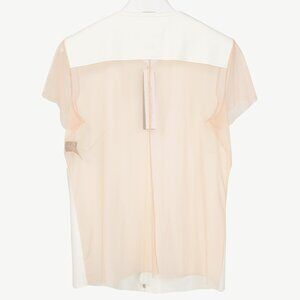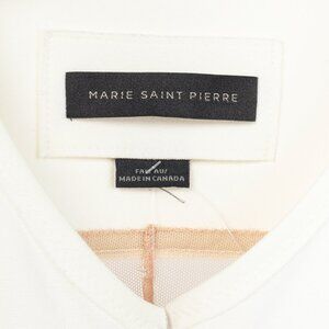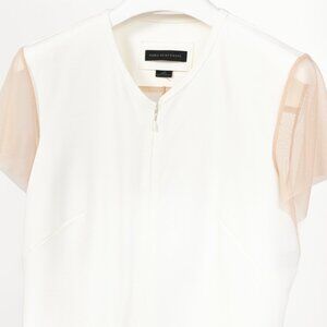 Made in Canada, this Nusar jacket from Marie Saint Pierre circa 2020 is crafted in a white weighted jersey, and is trimmed in a nude mesh on the sleeves and back. It features short sleeves, a V-shaped neckline, and a full invisible front zip closure.