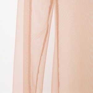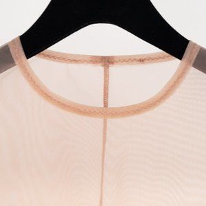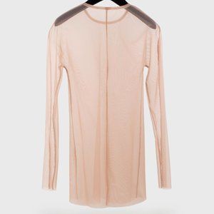 A fitted long sleeve crew neck top in dusty rose sheer stretch mesh from Canadian designer Marie Saint Pierre featuring and elongated hem and sleeves, making it a perfect base for layering.