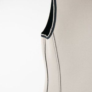 A dove grey lightweight neoprene tailored vest from Canadian designer Marie Saint Pierre featuring black contrast zigzag elastic stitching, inside out exposed zipper front closure, and a built-up neckline.