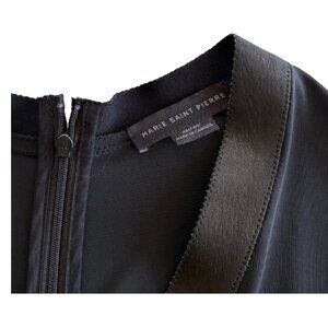 Marie Saint Pierre long-sleeve shift dress in black with an asymmetrical hem, a v-neckline, and a black leather trim at the collar and hem.