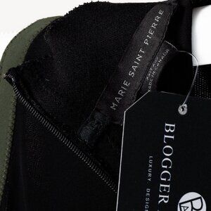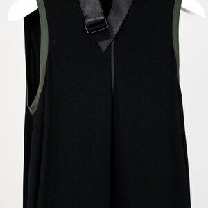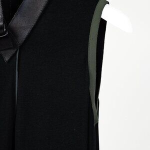 This truly one of a kind tunic from Marie Saint Pierre features an elastic stretchy body, no sleeves with green piping around the rim of the arms, and a v-neckline overlayed with a flat rope belt closure. Moving down the tunic the dress the sides are pleated in a way to provide hidden pockets, and the dress gradually widens to provide a flowy silhouette. Finally, the bottom hem is overlayed with a plush leather to give it that final touch.