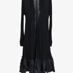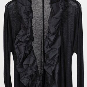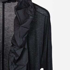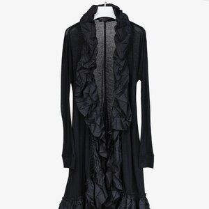 From Marie Sainte Pierre, this black duster maxi cardigan features a dramatic ruffled collar and hem that runs the length of the garment, elevating any outfit with a touch of sophistication. Made of 100% wool, this piece is for the discerning collector.