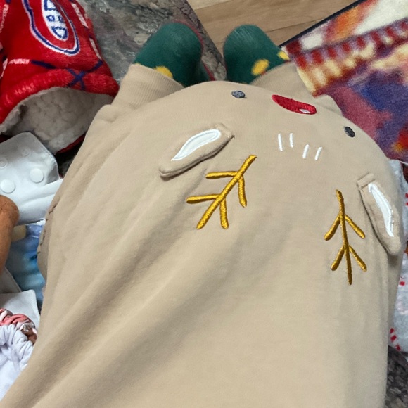 Adorable tan baby onesie with reindeer design. Features cute embroidered details.