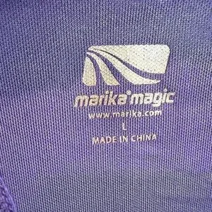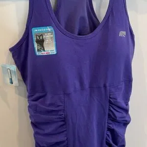 Marika tank top in a deep purple color. Sleeveless with scoop neckline. Ruched side panels for a flattering fit. Lightweight stretch fabric with subtle logo on chest. Great for workouts or casual wear.