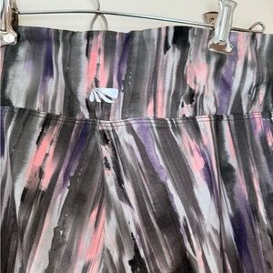 Stylish leggings with a striking streak pattern. Features black, gray, and pink tones. Perfect for active wear.