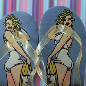 Marilyn Monroe Flip Flops. A few scuffs from storing, not from wear - soles in great, barely worn condition. They are marked size 6. They measure 9.25 inches from toe to heel. Neat! Thanks for the peek! #PoshmarkCanada