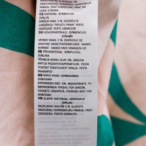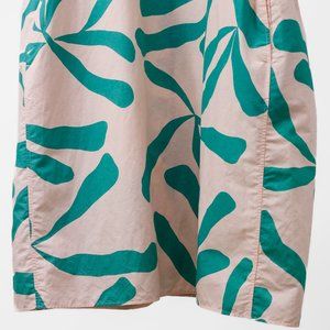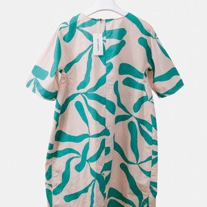 Marimekko’s Agnete Floretti A-line midi dress in peach features a round skirt silhouette with the Floretti pattern in green allover, elbow-length kimono sleeves, a v-neckline and two inseam side pockets.
