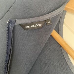 Short sleeve Marimekko Kirjava medium weight short-sleeved A-line dress in a gorgeous navy colour with a pop of orange/red along the hemline. On me, this is a midi length dress. For someone who is very tall this might hit just below the knee. Zip closure on back, no pockets.