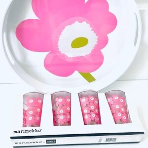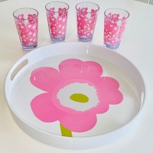 Marimekko Unikko By “Zak! Designs” Serving Tray and 4 Cup Set, Pink and White NWT