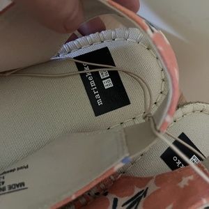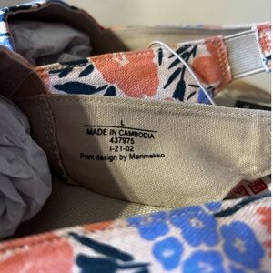 Marimekko & Uniqlo collab orange and blue floral open toe espadrilles flats new with tags. Limited edition, orange, cream and blue flowers, cotton exterior, open toe and heel, elastic gusset to accommodate different feet shapes. The insole is very squishy and comfortable, feels like walking on clouds. Marked size L which is supposed to fit size US 8 but they run a little larger in my opinion. The insole length is 10’’ which would fit a shoe size US 8.5-9 imo, please see pics for measurements. This item comes from a smoke free, pets friendly home. Recycled bags/box used when possible. Please, let me know if you'd like any additional info. Thanks for watching! *Please note that I've listed them as a size 8.5 because this is my size and they fit me well, but they could also accommodate a size 9. They are marked size L.