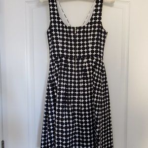 Flattering fit-and-flare dress in black and white Kivet dot print. Pleated skirt and pleats at the bust. Heavier-weight woven fabric.