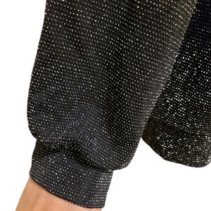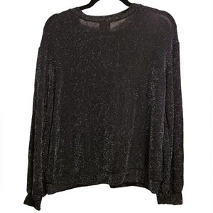 Black top with silver beads throughout, that create a metallic shimmer effect when the fabric moves. Slightly ballooned sleeves, and a crew neckline. Like new condition, still has part of the tag attached. Tagged XL but fits more M/L. Made in Canada.