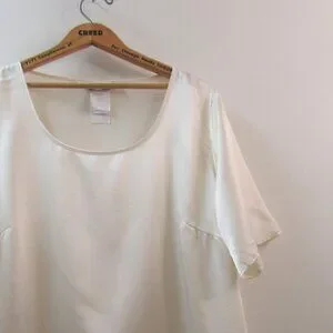 Elegant cream top with a relaxed fit. Features a scoop neckline and short sleeves. Perfect for casual or formal wear.