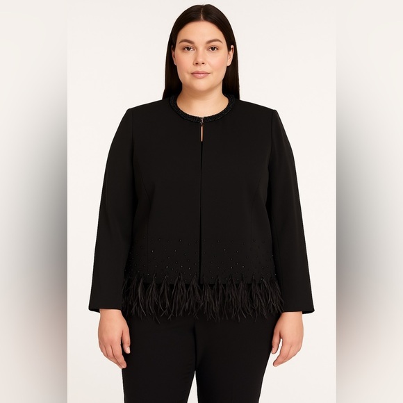 Keywords: Marina Rinaldi black blazer, feather trim jacket, beaded blazer, luxury Italian jacket, plus size designer blazer