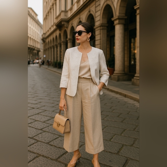 Cropped sleeves, possibly 3/4 length, offering a chic, modern silhouette.