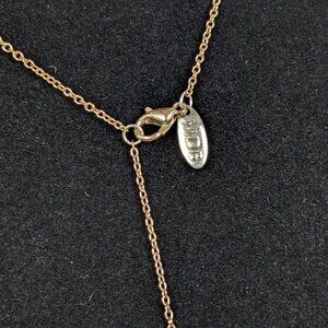 This necklace by Marina de Buchi (MDB) is made of a gold plated metal and has an adjustable 3-position lobster clasp closure. There is also an oval-shaped maker's tag stamped MDB. The necklace chain is lightweight and dainty, and affixes directly to either end of the little crucifix. The pendant can be worn in the center or off-center, depending on your style. There is normal wear throughout, including some tone inconsistency in the tone of the metal, which might be the plating wearing away with time and wear.