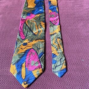 Stylish tie with abstract design. Features blue, green, and orange hues. Ideal for a bold look.