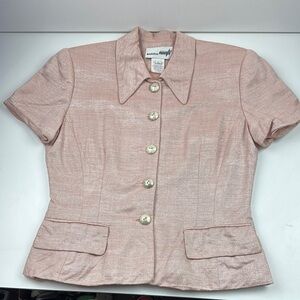 This chic blazer features a soft pink hue with silver accents, offering a tailored fit and short sleeves for a modern, professional look. Its lightweight linen blend fabric ensures comfort while maintaining a polished appearance, making it ideal for both formal and casual settings.