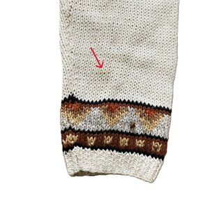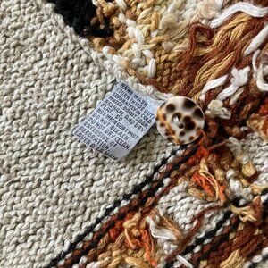 Vintage Maria Christina Classics beige knit cardigan has design of a leopard & tiger on each front side, with the leopard tail design wrapping around to the back of cardigan. Beaded detail on the sleeve cuffs & hem border. Button front closures. 46% ramie/45% cotton/9% linen, tag says hand wash. Made in Hong Kong. Pre-owned condition: right sleeve cuff has pink nail polish/paint mark, underside of sleeves has a few faint discolorations. See close-up photos. Tag size "Medium", see below for garment measurements.