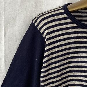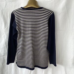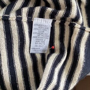Gold black metallic, acrylic cotton, long sleeve, metallic thread, black and gold stripe, round neck, made in Hong Kong, EUC, neck to hem 25”, armpit to armpit 18”, armpit to cuff 19”.