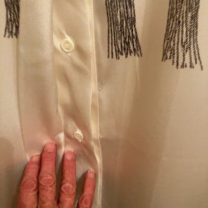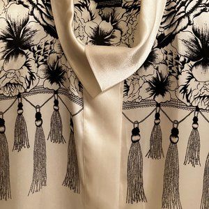 classic Mark Allan patterned blouse, size small(5/6), satin polyester, cream with black floral and tassel pattern, like new, hidden buttons, rounded fold oner collar