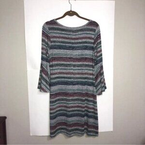Market & Spruce Striped Dress M Green Blue Wine Grey Long Bell Sleeve Knee Length