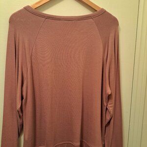 Women's Market and spruce top with 3 front buttons in a clay like color, size large, gently worn once, Blend of Rayon 96% and Spandex 4%, machine wash, lay flat to dry. A nice causal, comfortable yet stylish top add to your fall wardrobe!
