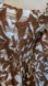 Stylish midi dress with a brown and white floral pattern. Features a smocked bodice and wide straps. Perfect for casual outings.