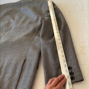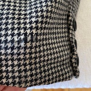 Wool and cashmere blazer featuring a classic houndstooth pattern. Ideal for both professional and casual settings. Blazer is in very good condition other than one call out. There is a small flaw on the back of the cuff where the material is damaged. It’s quite small, but it is there. Please see photos.