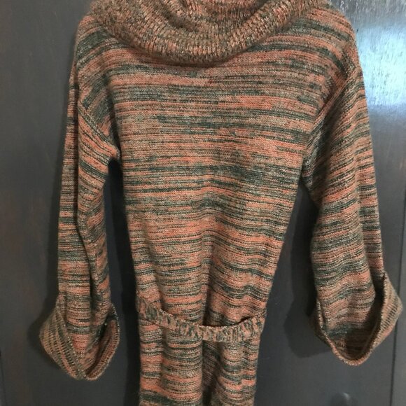 Vintage grey and pink sweater with a tie belt. The sweater has a cowl neckline. The length is 30" from shoulder to hem. The material is 85% acrylic, 10% mohair and 5% nylon. Made in the U.K. There is a small blemish on the back of the sweater where the stitches had come unraveled but is not noticeable with the muted colors (see picture). The sweater looks great with leggings because of the long length.