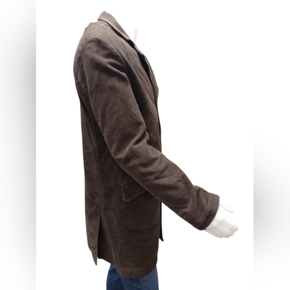 Vintage Mens jacket in GUC. Long sleeve with four pockets, this dark brown, velvety jacket is fully lined featuring wool and a three button closure.