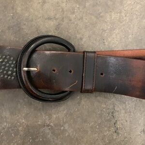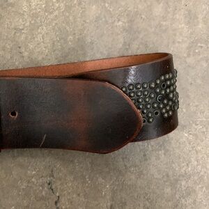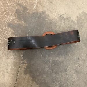 Stylish brown leather belt featuring black accents. Perfect for adding a touch of elegance to any outfit.