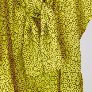 Released for Marni's 2011 Autumn and Winter collection is this oversized draped ruffle blouse in bright lemon yellow geometric kaleidoscope star printed crepe fabric, featuring a large tie collar, deep arm holes, and an oval cut-out at the back waist.