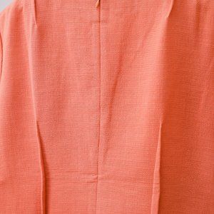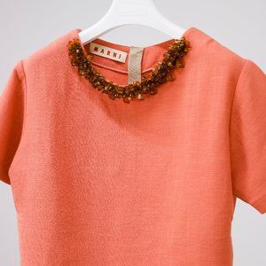 An oversized tailored t-shirt style tunic in medium-weight soft rose pink wool crepe, featuring an amber-hued crystal-cut beaded collar, reverse darts at the back shoulders and waist, and an invisible zipper back closure.