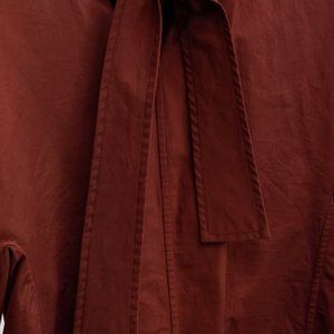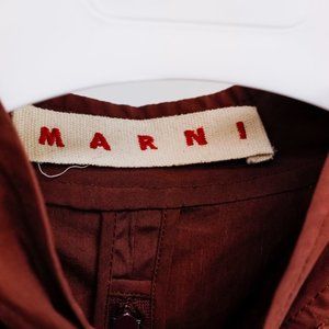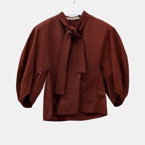 A cotton poplin top from Marni in copper brown featuring a keyhole tie neckline, elbow-length raglan puff sleeves, paneling construction at the sides, and a concealed zip closure at the back.