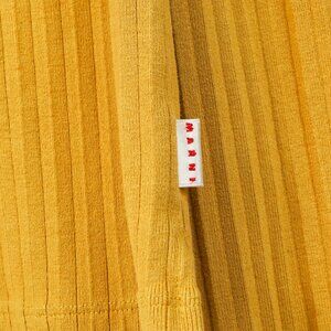 Made in Italy, this top from Marni circa 2020 is crafted in a chartreuse cotton ribbed knit, and features exaggerated long sleeves, a mock neck, a straight fit throughout the bodice, and side slits.
