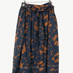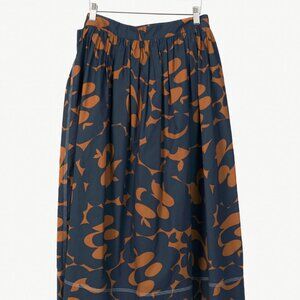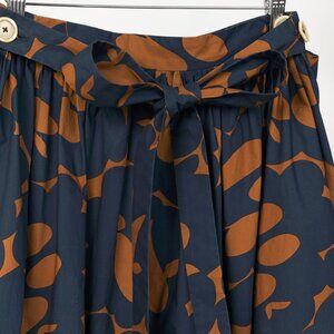Made in Italy, this skirt from Marni's 2019 Resort collection is crafted with a navy cotton poplin in the Belou floral print, and features a gathered waist, self ties with button closures, side-seam pockets, an A-line silhouette, a midi-length hem, and contrast white topstitching.