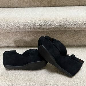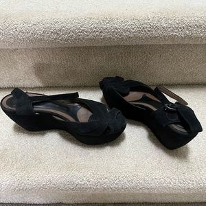 Beautiful Marni black suede sandals. Very retro / 1940's style with a buckle strap and platform heels. In excellent condition, size 38 - 7/7.5. Measurements as follows: