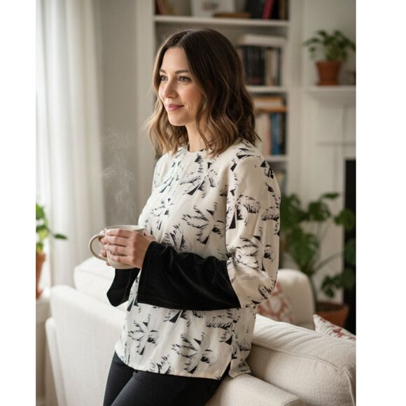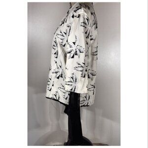 White/Black Marni cardigan blazer with tropical print. One snap button with round neck and partly open back. The lining is meant to look frayed and extending the length of the sleeves for a cool business edge.