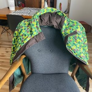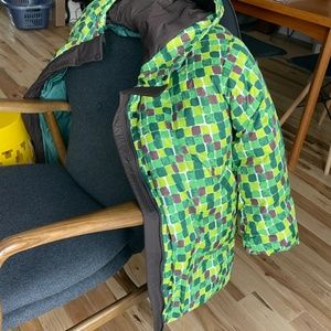 Puffy, warm, colourful winter jacket with a hood. New with tags.